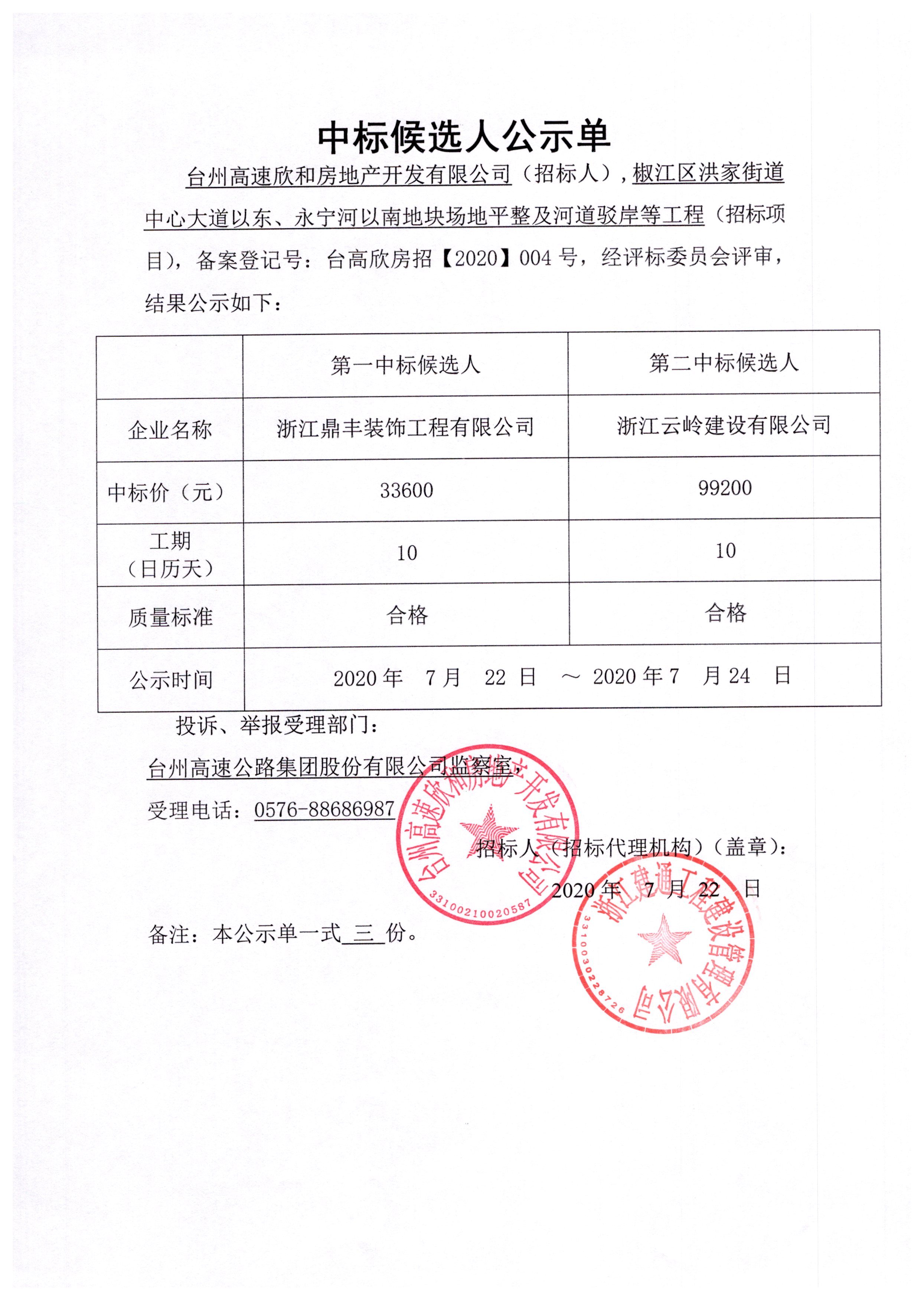椒江區(qū)洪家街道中心大道以東、永寧河以南地塊場(chǎng)地平整及河道駁岸等工程(招標(biāo)項(xiàng)目)中標(biāo)候選人公示單