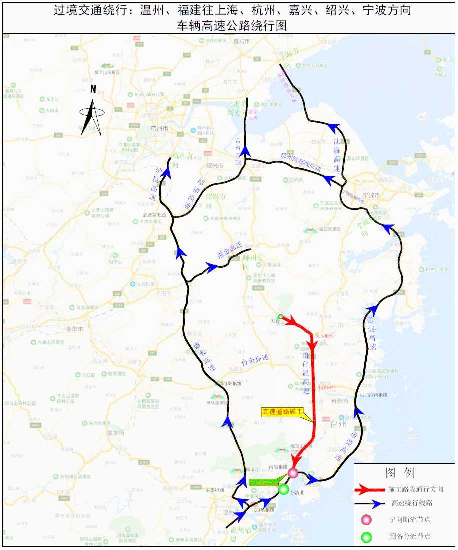 在甬臺溫高速寧波方向南塘樞紐進行斷流,所有車輛改走甬莞高速;甬莞高速南塘樞紐轉甬臺溫高速寧波方向匝道關閉;臺金高速水洋樞紐轉甬臺溫高速寧波方向匝道關閉;甬臺溫高速溫州方向吳岙樞紐轉上三高速上虞方向匝道關閉;甬臺溫高速溫州方向、上三高速三門方向保持通行,部分路段借用對向車道通行。