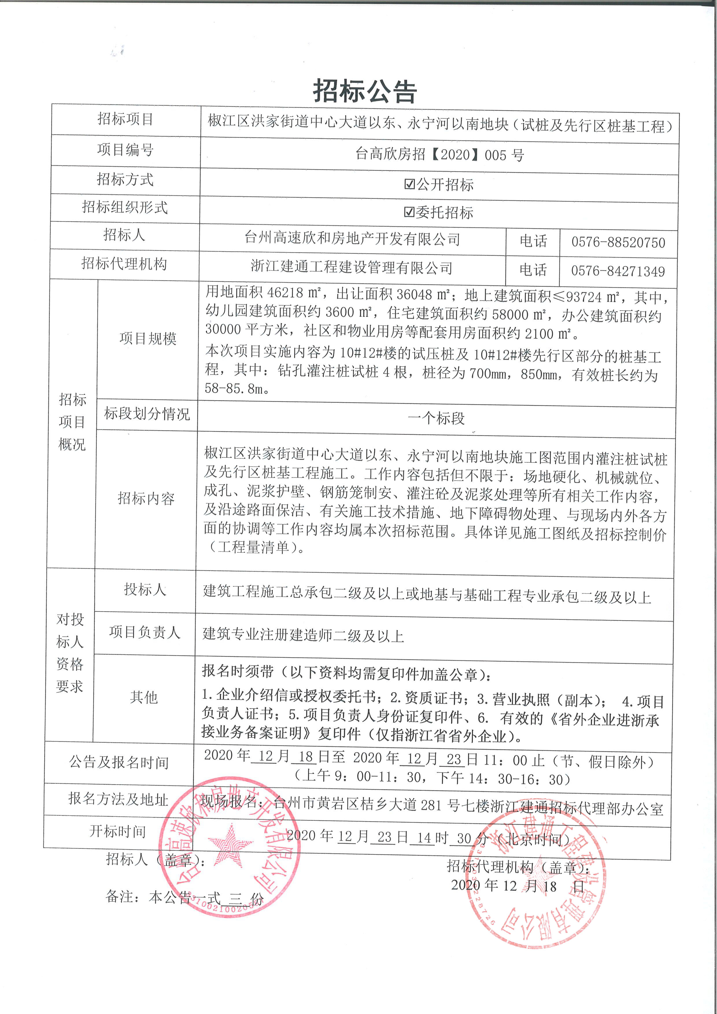 椒江區(qū)洪家街道中心大道以東、永寧河以南地塊(試樁及先行區(qū)樁基工程)招標(biāo)公告