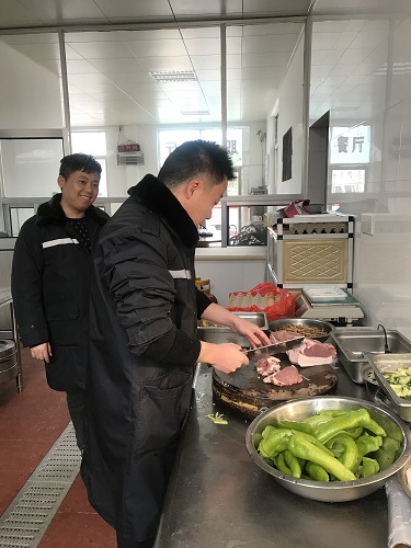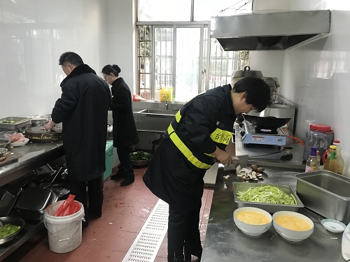 圖為工作人員幫忙做飯 臨近春節(jié)又正值春運(yùn)期間,一時(shí)也找不到人員替代。為了保證員工正常用餐,中午,楊瑩瑩決定親自下廚為員工做飯,冰冷的水里直接洗菜,掄起廚刀剁肉切菜,卷起袖子熱鍋炒菜,儼然成為合格的大廚。副所長(zhǎng)周超、杜佳自動(dòng)加入司廚行列,其他行政人員在一旁配合摘菜、剝蒜等等,正在休息的班組其他人員見狀也紛紛前來幫忙。這一刻,小小廚房其樂融融,那是家的味道。午餐過后,楊瑩瑩又開始考慮晚餐和明天的早餐,但是她不再發(fā)愁,因?yàn)樯砗筮€有無數(shù)個(gè)他們。