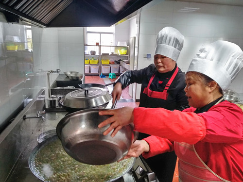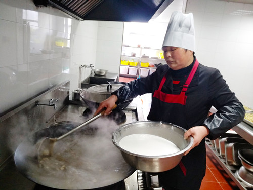 浸了一夜的早米,用石磨磨成米漿,細膩而幼滑,被靜置在盆里?!耙话愣加妹追叟菟?,口感粗糙,而且吃起來沒有香頭?!崩ㄒ贿呎f,一邊將香腸切碎與豆腐、冬筍、胡蘿卜、芹菜、香菇、蠶豆瓣翻炒著。旁邊的大鍋里,長長的豆面在骨頭湯里翻滾著,像一棵棵舞蹈的海草。徐徐倒入的米漿,被不停地攪拌,“要是粘到鍋,就會有焦糊味,這鍋羹就算廢了?!泵诐{好像不夠,利花有些懊惱,“要是在家里,米漿都會多準備一些,不夠就隨手添,我?guī)У竭@里就這些,也沒得加了。”就叫在一邊做幫手的妹妹寶花用面粉和山粉(也就是番薯粉)摻水拌起來,倒入鍋里,湯漸漸濃稠起來,倒入之前炒好的配料,加上切得細細的綠綠的芥菜梗、芥菜葉、海蠣,鍋里不時冒起大泡,香氣四溢。 為照顧吃不慣糟羹的同事,食堂還準備了一鍋甜的山粉糊。來自臺州各縣市區(qū)的同事,按各自飲食習(xí)慣選擇了咸的或甜的。有說芹菜的味道蓋過了芥菜清香的,有說沒有加入芋頭口感不夠糊的,但撲鼻的香氣和濃厚豐富的口感立刻讓人忘了挑剔。對我來說,碧綠的芥菜葉和白胖的海蠣肉是整碗羹的顏值擔當和靈魂所在。 每個元宵節(jié),對于在崗的同事們是沒有花燈可看、沒有燈謎可猜的,也不能與家人聚在一起吃羹。車道上此刻正是流量高峰期,大家匆匆吃完,都要趕著上崗。食堂大姐把多出的糟羹和山粉糊放進蒸飯鍋保溫,叮囑大家下班后再來吃點,這個吃了不扛餓。此時,除了食物最能體現(xiàn)節(jié)日氣氛外,還有那一份特意為你留著的溫熱更讓人感動。 鄭瑛芝