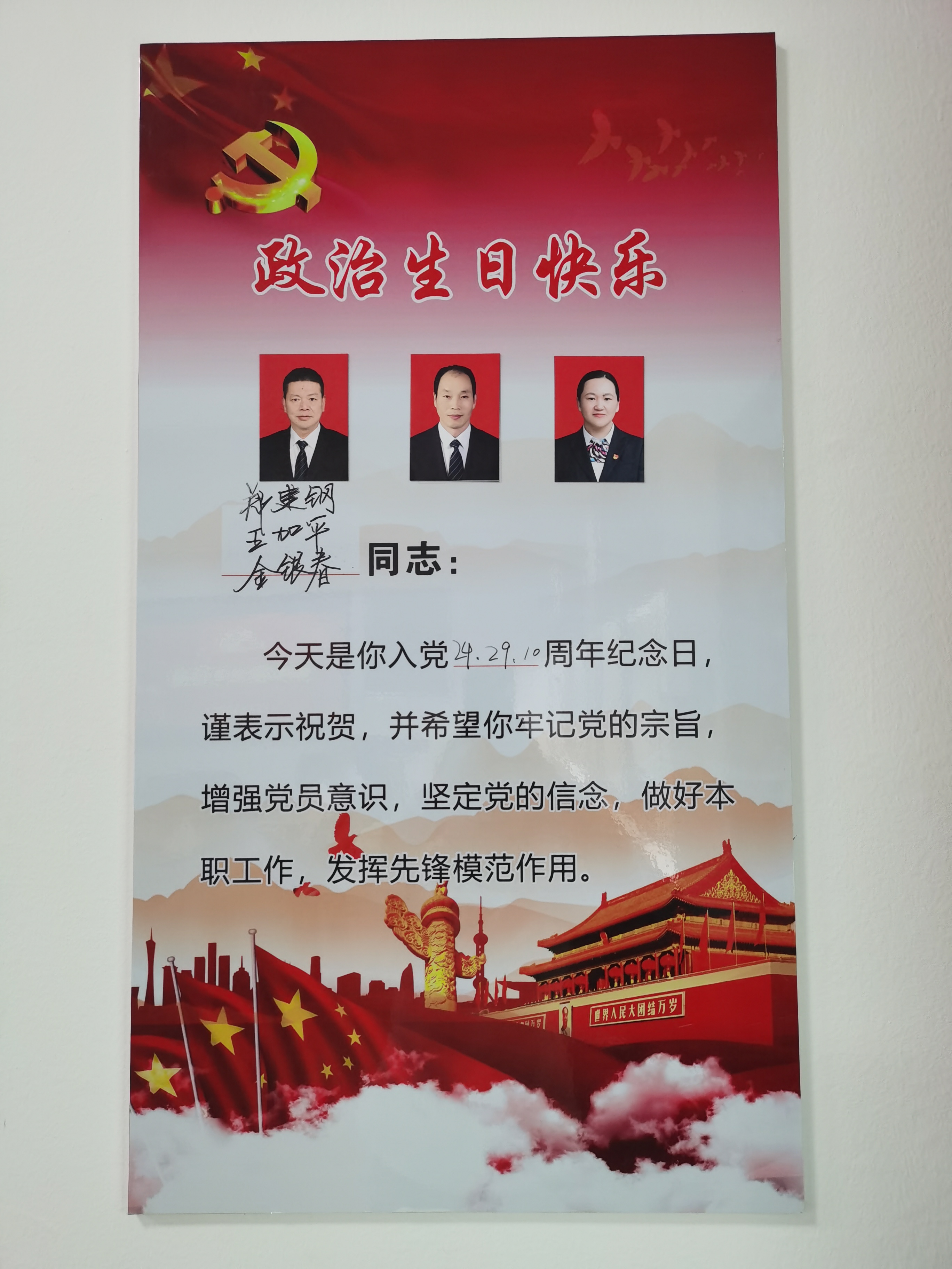王加平、鄭建鋼分別是有著29年、24年黨齡的老黨員,他們向其他黨員分享了各自入黨以來(lái)的心路歷程,從工作中的細(xì)微處做起,深刻檢討自己在發(fā)揮黨員先鋒模范作用上做的不足之處,激勵(lì)和鞭策自己。他們一句句質(zhì)樸的語(yǔ)言,讓我們走進(jìn)了他們的生活,感受了他們不忘初心的激情歲月。在活動(dòng)過(guò)程中,支委成員為過(guò)生日黨員贈(zèng)送了賀卡。