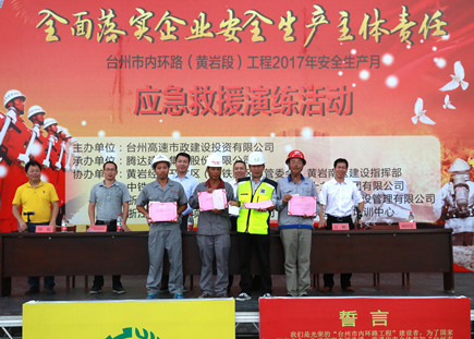集團(tuán)總工程師江輝,安全總監(jiān)項同富,騰達(dá)建設(shè)集團(tuán)總經(jīng)理楊九如出席活動,黃巖東區(qū)、南區(qū)建設(shè)指揮部相關(guān)人員,內(nèi)環(huán)路(黃巖段)工程施工單位項目領(lǐng)導(dǎo)、專職安全員,市政公司全體員工參加活動。
